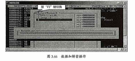 此功能可以对数据或者代码进行一些简单的加解密运算。用hiew打开3.3.16提到的encrypted程序,在十六进制或者代码模式下按F3进入编辑状态。在按F7进入加密模式界面,再按enter输入指令,如图所示可以在byte word dword格式当中切换。
