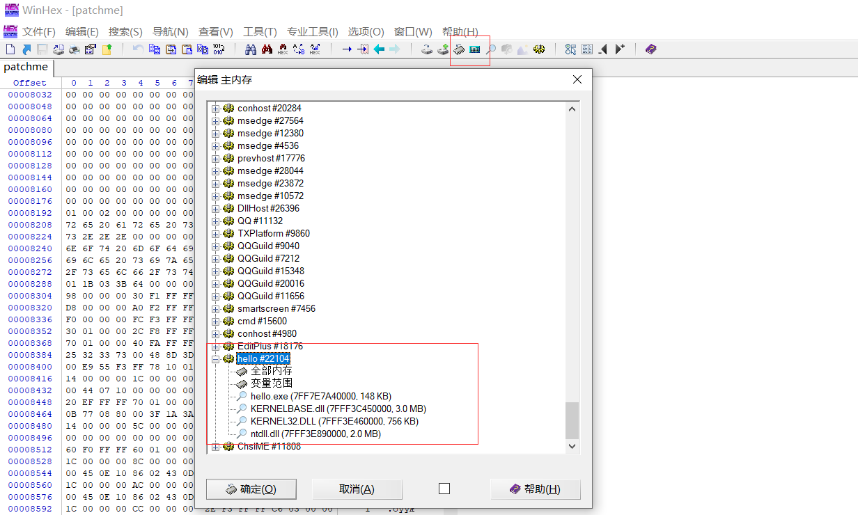 使用winhex查看内存中的这个进程