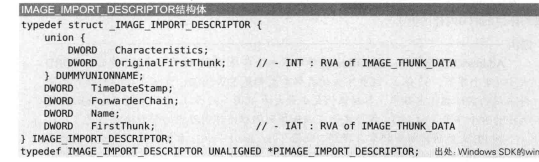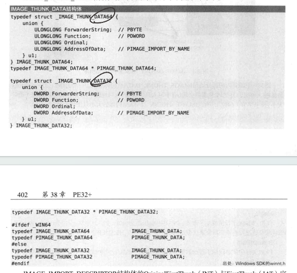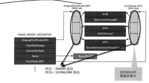 其中IMAGE_IMPORT_DESCRIPTOR结构体的OriginalFirstThunk ( INT)与FirstThunk( IAT )字段值都是指向IMAGETHUNK DATA结构体数组的RVA