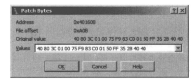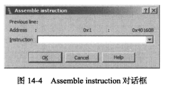“修补程序”菜单中最有趣的功能,可能要数“汇编”选项( Edit > Patch Program b Assemble )。遗憾的是,这项功能并非对所有处理器类型有效,因为它取决于当前的处理器模块是否拥有一个内部汇编器。例如,x86处理器模块支持汇编,而MIPS处理器模块却不支持汇编。如果缺乏汇编器,你将收到- - 条错误消息,它指出:“对不起,本处理器模块不支持这种汇编器。”利用“汇编”选项可以输人使用-一个内部汇编器汇编的汇编语言语句。然后, IDA会将得到的指令字节写人当前的屏幕位置。用于输人指令的Assemble instruction对话框如图14 4所示。