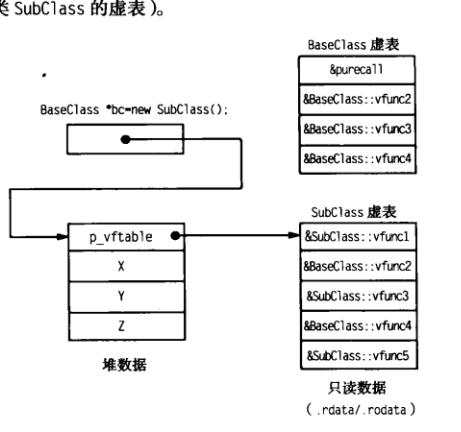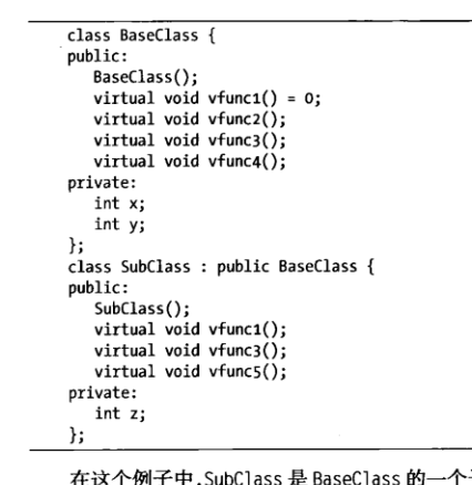 subclass是baseclass的一个子类。而subclass拥有五个虚函数。看似baseclass拥有两个数据成员,subclass拥有三个。但前面提到任何包含虚函数的类也包含一个虚表指针。