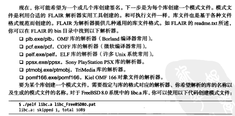 /sig目录中,安装这个文件。 ##识别和获取静态库   ##创建模式文件 为一个库或者几个库创建签名。 ##创建签名文件 没学明白。 ##启动签名 用于创建一个二进制文件的编译器时,IDA会应用这个签名。 #扩展IDA知识 #扩充函数信息 IDA通过两种途径获得与函数有关的信息:类型库( .til)文件和IDS实用工具( .ids)文件。 在初始分析阶段, IDA使用存储在这些文件中的信息来提高反汇编过程的准确性及反汇编代码清 单的可读性。它通过合并函数参数名称和类型,以及与各种库函数有关的注释来完成这个任务。 第8章曾提到过,类型库文件是IDA用于存储复杂数据结构布局的机制。同时, IDA还使用 类型库文件记录与函数的调用约定和参数序列有关的信息。IDA以各种方式使用函数签名信息。 首先,当一个二进制文件使用共享库时,IDA 无法知道这些库中的函数使用的是什么调用约定。 这时, IDA会尝试根据一个类型库 文件中的相关签名来匹配库函数。如果它发现一个匹配的签名, IDA就可以知道这个函数使用的调用约定,并对栈指针进行必要的调整(如前所述,stdcall 函 数自己对栈进行清理)。使用函数签名的第二种方式是为传递给函数的参数提供注释。这些注释 说明在调用函数之前,到底是哪一个参数被压人到栈上。注释提供的信息量取决于IDA能够解 析的函数签名所包含的信息量。下面的两个签名都是有效的C声明,第二个签名提供了更多有关 函数的信息,除数据类型以外,它还提供了形式参数名称。 显示函数原型的注释来自IDA的一个.til文件,该文件提供与Windows API函数有关的信息。 那么,在什么情况下,你希望生成自己的函数类型签名°呢?如果你遇到-一个链接到(无论 是动态还是静态) IDA并不包含其函数原型的库的二进制文件,你可能希望为这个库中的所有函 数生成类型签名信息,以便IDA能够为自动为你的反汇编代码清单生成注释。这类库包括常用 的图形或加密库,虽然它们不属于标准Windows库,但却使用广泛。OpenSSL加密库就是这样 -个库。