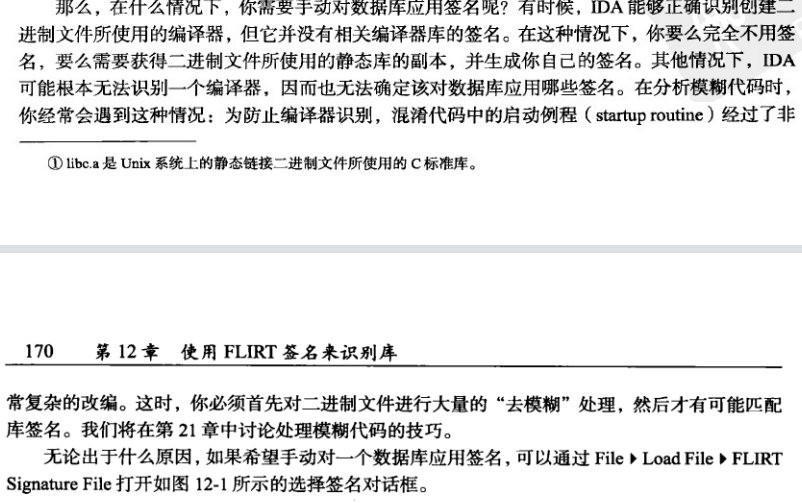 /sig目录中,安装这个文件。 ##识别和获取静态库   ##创建模式文件 为一个库或者几个库创建签名。 ##创建签名文件 没学明白。 ##启动签名 用于创建一个二进制文件的编译器时,IDA会应用这个签名。 #扩展IDA知识 #扩充函数信息 IDA通过两种途径获得与函数有关的信息:类型库( .til)文件和IDS实用工具( .ids)文件。 在初始分析阶段, IDA使用存储在这些文件中的信息来提高反汇编过程的准确性及反汇编代码清 单的可读性。它通过合并函数参数名称和类型,以及与各种库函数有关的注释来完成这个任务。 第8章曾提到过,类型库文件是IDA用于存储复杂数据结构布局的机制。同时, IDA还使用 类型库文件记录与函数的调用约定和参数序列有关的信息。IDA以各种方式使用函数签名信息。 首先,当一个二进制文件使用共享库时,IDA 无法知道这些库中的函数使用的是什么调用约定。 这时, IDA会尝试根据一个类型库 文件中的相关签名来匹配库函数。如果它发现一个匹配的签名, IDA就可以知道这个函数使用的调用约定,并对栈指针进行必要的调整(如前所述,stdcall 函 数自己对栈进行清理)。使用函数签名的第二种方式是为传递给函数的参数提供注释。这些注释 说明在调用函数之前,到底是哪一个参数被压人到栈上。注释提供的信息量取决于IDA能够解 析的函数签名所包含的信息量。下面的两个签名都是有效的C声明,第二个签名提供了更多有关 函数的信息,除数据类型以外,它还提供了形式参数名称。 显示函数原型的注释来自IDA的一个.til文件,该文件提供与Windows API函数有关的信息。 那么,在什么情况下,你希望生成自己的函数类型签名°呢?如果你遇到-一个链接到(无论 是动态还是静态) IDA并不包含其函数原型的库的二进制文件,你可能希望为这个库中的所有函 数生成类型签名信息,以便IDA能够为自动为你的反汇编代码清单生成注释。这类库包括常用 的图形或加密库,虽然它们不属于标准Windows库,但却使用广泛。OpenSSL加密库就是这样 -个库。