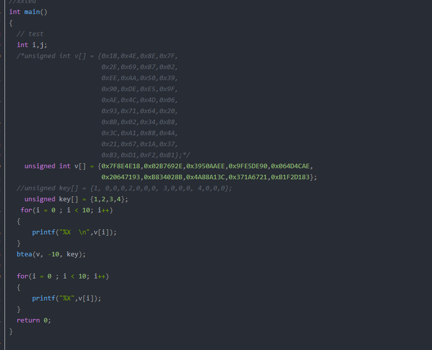 不晓得这个是啥意思,后面查了一下别人的writeup发现这个是tea加密,还是个变种tea加密,无奈本人加解密知识不精,直接就借鉴别人的题解吧(侵删)