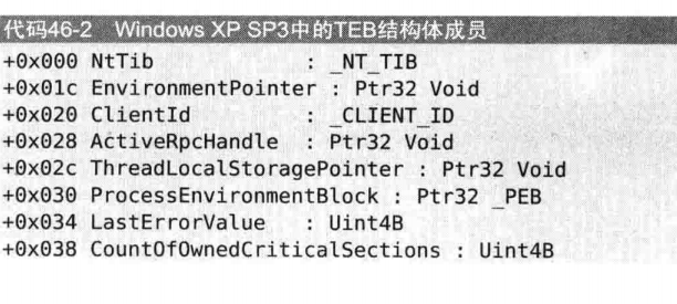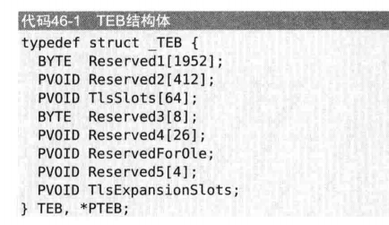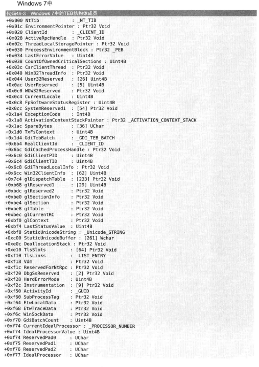 - Handler指向这个节点处理某个异常的函数 。 StackBase 这个线程的堆栈的最高地址 StackLimit堆栈的最低地址 FiberData/Version 联合体,多线程编程的时候使用。FiberData指向Fiber数据结构,实现轻量级线程的切换。Version记录操作系统版本,以供兼容性。 ArbitraryUserPointer 指向任何一个用户定义的数据 。 关于NT_TIB与TEB的关系: NT_TIB是TEB当的一个重要成员,而NT_TIB中又有如上的各个成员。 除了NT_TIB之外还有如 PEB进程环境块 ActivationContextStackPointer 激活上下文的栈指针 等等成员