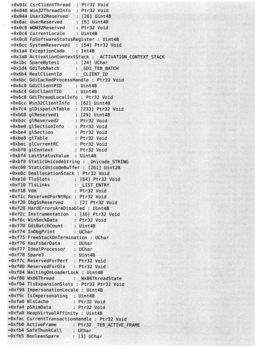 ``` 0:000> dt _teb ntdll!_TEB +0x000 NtTib : _NT_TIB +0x01c EnvironmentPointer : Ptr32 Void +0x020 ClientId : _CLIENT_ID +0x028 ActiveRpcHandle : Ptr32 Void +0x02c ThreadLocalStoragePointer : Ptr32 Void +0x030 ProcessEnvironmentBlock : Ptr32 _PEB +0x034 LastErrorValue : Uint4B +0x038 CountOfOwnedCriticalSections : Uint4B +0x03c CsrClientThread : Ptr32 Void +0x040 Win32ThreadInfo : Ptr32 Void +0x044 User32Reserved : [26] Uint4B +0x0ac UserReserved : [5] Uint4B +0x0c0 WOW32Reserved : Ptr32 Void +0x0c4 CurrentLocale : Uint4B +0x0c8 FpSoftwareStatusRegister : Uint4B +0x0cc ReservedForDebuggerInstrumentation : [16] Ptr32 Void +0x10c SystemReserved1 : [26] Ptr32 Void +0x174 PlaceholderCompatibilityMode : Char +0x175 PlaceholderHydrationAlwaysExplicit : UChar +0x176 PlaceholderReserved : [10] Char +0x180 ProxiedProcessId : Uint4B +0x184 _ActivationStack : _ACTIVATION_CONTEXT_STACK +0x19c WorkingOnBehalfTicket : [8] UChar +0x1a4 ExceptionCode : Int4B +0x1a8 ActivationContextStackPointer : Ptr32 _ACTIVATION_CONTEXT_STACK +0x1ac InstrumentationCallbackSp : Uint4B +0x1b0 InstrumentationCallbackPreviousPc : Uint4B +0x1b4 InstrumentationCallbackPreviousSp : Uint4B +0x1b8 InstrumentationCallbackDisabled : UChar +0x1b9 SpareBytes : [23] UChar +0x1d0 TxFsContext : Uint4B +0x1d4 GdiTebBatch : _GDI_TEB_BATCH +0x6b4 RealClientId : _CLIENT_ID +0x6bc GdiCachedProcessHandle : Ptr32 Void +0x6c0 GdiClientPID : Uint4B +0x6c4 GdiClientTID : Uint4B +0x6c8 GdiThreadLocalInfo : Ptr32 Void +0x6cc Win32ClientInfo : [62] Uint4B +0x7c4 glDispatchTable : [233] Ptr32 Void +0xb68 glReserved1 : [29] Uint4B +0xbdc glReserved2 : Ptr32 Void +0xbe0 glSectionInfo : Ptr32 Void +0xbe4 glSection : Ptr32 Void +0xbe8 glTable : Ptr32 Void +0xbec glCurrentRC : Ptr32 Void +0xbf0 glContext : Ptr32 Void +0xbf4 LastStatusValue : Uint4B +0xbf8 StaticUnicodeString : _UNICODE_STRING +0xc00 StaticUnicodeBuffer : [261] Wchar +0xe0c DeallocationStack : Ptr32 Void +0xe10 TlsSlots : [64] Ptr32 Void +0xf10 TlsLinks : _LIST_ENTRY +0xf18 Vdm : Ptr32 Void +0xf1c ReservedForNtRpc : Ptr32 Void +0xf20 DbgSsReserved : [2] Ptr32 Void +0xf28 HardErrorMode : Uint4B +0xf2c Instrumentation : [9] Ptr32 Void +0xf50 ActivityId : _GUID +0xf60 SubProcessTag : Ptr32 Void +0xf64 PerflibData : Ptr32 Void +0xf68 EtwTraceData : Ptr32 Void +0xf6c WinSockData : Ptr32 Void +0xf70 GdiBatchCount : Uint4B +0xf74 CurrentIdealProcessor : _PROCESSOR_NUMBER +0xf74 IdealProcessorValue : Uint4B +0xf74 ReservedPad0 : UChar +0xf75 ReservedPad1 : UChar +0xf76 ReservedPad2 : UChar +0xf77 IdealProcessor : UChar +0xf78 GuaranteedStackBytes : Uint4B +0xf7c ReservedForPerf : Ptr32 Void +0xf80 ReservedForOle : Ptr32 Void +0xf84 WaitingOnLoaderLock : Uint4B +0xf88 SavedPriorityState : Ptr32 Void +0xf8c ReservedForCodeCoverage : Uint4B +0xf90 ThreadPoolData : Ptr32 Void +0xf94 TlsExpansionSlots : Ptr32 Ptr32 Void +0xf98 MuiGeneration : Uint4B +0xf9c IsImpersonating : Uint4B +0xfa0 NlsCache : Ptr32 Void +0xfa4 pShimData : Ptr32 Void +0xfa8 HeapData : Uint4B +0xfac CurrentTransactionHandle : Ptr32 Void +0xfb0 ActiveFrame : Ptr32 _TEB_ACTIVE_FRAME +0xfb4 FlsData : Ptr32 Void +0xfb8 PreferredLanguages : Ptr32 Void +0xfbc UserPrefLanguages : Ptr32 Void +0xfc0 MergedPrefLanguages : Ptr32 Void +0xfc4 MuiImpersonation : Uint4B +0xfc8 CrossTebFlags : Uint2B +0xfc8 SpareCrossTebBits : Pos 0, 16 Bits +0xfca SameTebFlags : Uint2B +0xfca SafeThunkCall : Pos 0, 1 Bit +0xfca InDebugPrint : Pos 1, 1 Bit +0xfca HasFiberData : Pos 2, 1 Bit +0xfca SkipThreadAttach : Pos 3, 1 Bit +0xfca WerInShipAssertCode : Pos 4, 1 Bit +0xfca RanProcessInit : Pos 5, 1 Bit +0xfca ClonedThread : Pos 6, 1 Bit +0xfca SuppressDebugMsg : Pos 7, 1 Bit +0xfca DisableUserStackWalk : Pos 8, 1 Bit +0xfca RtlExceptionAttached : Pos 9, 1 Bit +0xfca InitialThread : Pos 10, 1 Bit +0xfca SessionAware : Pos 11, 1 Bit +0xfca LoadOwner : Pos 12, 1 Bit +0xfca LoaderWorker : Pos 13, 1 Bit +0xfca SkipLoaderInit : Pos 14, 1 Bit +0xfca SpareSameTebBits : Pos 15, 1 Bit +0xfcc TxnScopeEnterCallback : Ptr32 Void +0xfd0 TxnScopeExitCallback : Ptr32 Void +0xfd4 TxnScopeContext : Ptr32 Void +0xfd8 LockCount : Uint4B +0xfdc WowTebOffset : Int4B +0xfe0 ResourceRetValue : Ptr32 Void +0xfe4 ReservedForWdf : Ptr32 Void +0xfe8 ReservedForCrt : Uint8B +0xff0 EffectiveContainerId : _GUID ```而其中NT BIT当中有一个成员ExceptionList还可以研究一下